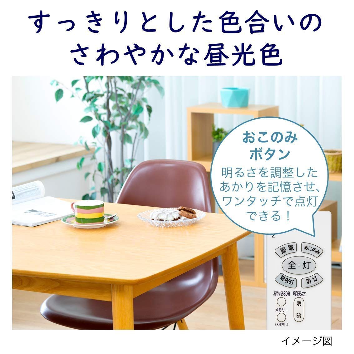 〇さわやかな昼光色 明るさはおこのみで調整できます(調光機能付き) 〇節電モード ワンタッチで明るさを減光し、消費電力を全灯時より約30%抑えます 〇おこのみボタン 明るさを調節して登録したあかりを、ワンタッチで点灯 〇コンパクトなデザイン 薄くて、小さい形状)