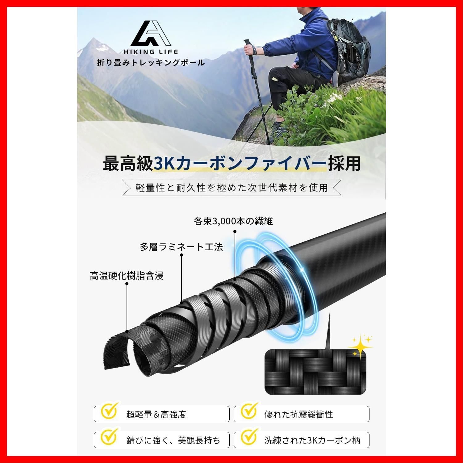 アウトドア ウォーキング 登山 日本語説明書 ハイキング 5種類 収納ポーチ付き 100 120 cm調整 遠足 ウォーキングポール 収納サイズ34 cm 登山用ストック 2本セット 超軽量198 g 散歩 折り畳み式 3 Kカーボン トレッキン