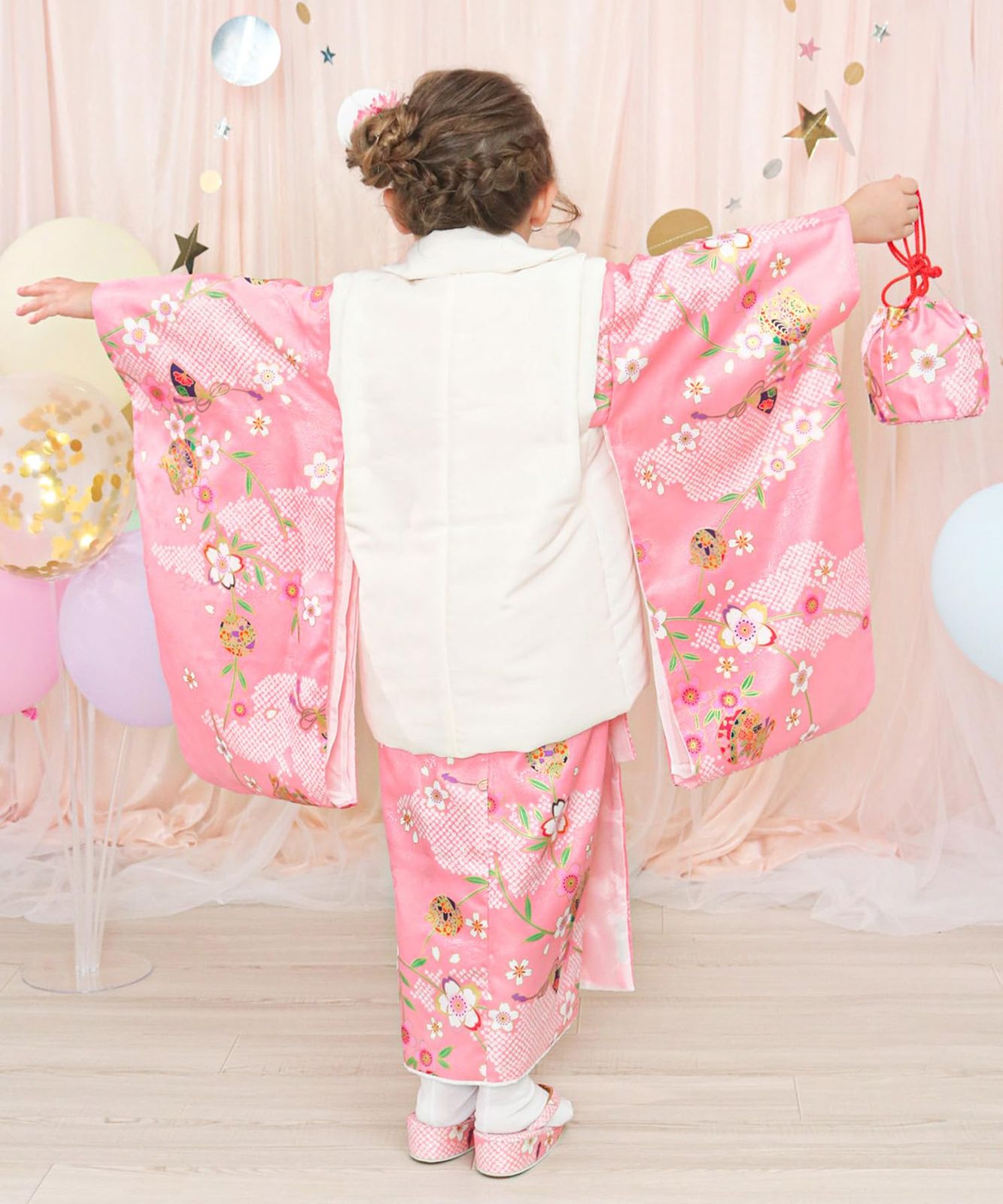 ・3歳の女の子への七五三祝いに。一生の思い出を彩るかわいいデザインの着物セットを揃えました。巾着や髪飾りなどの小物までセットになっているので、届いてすぐに着られます。