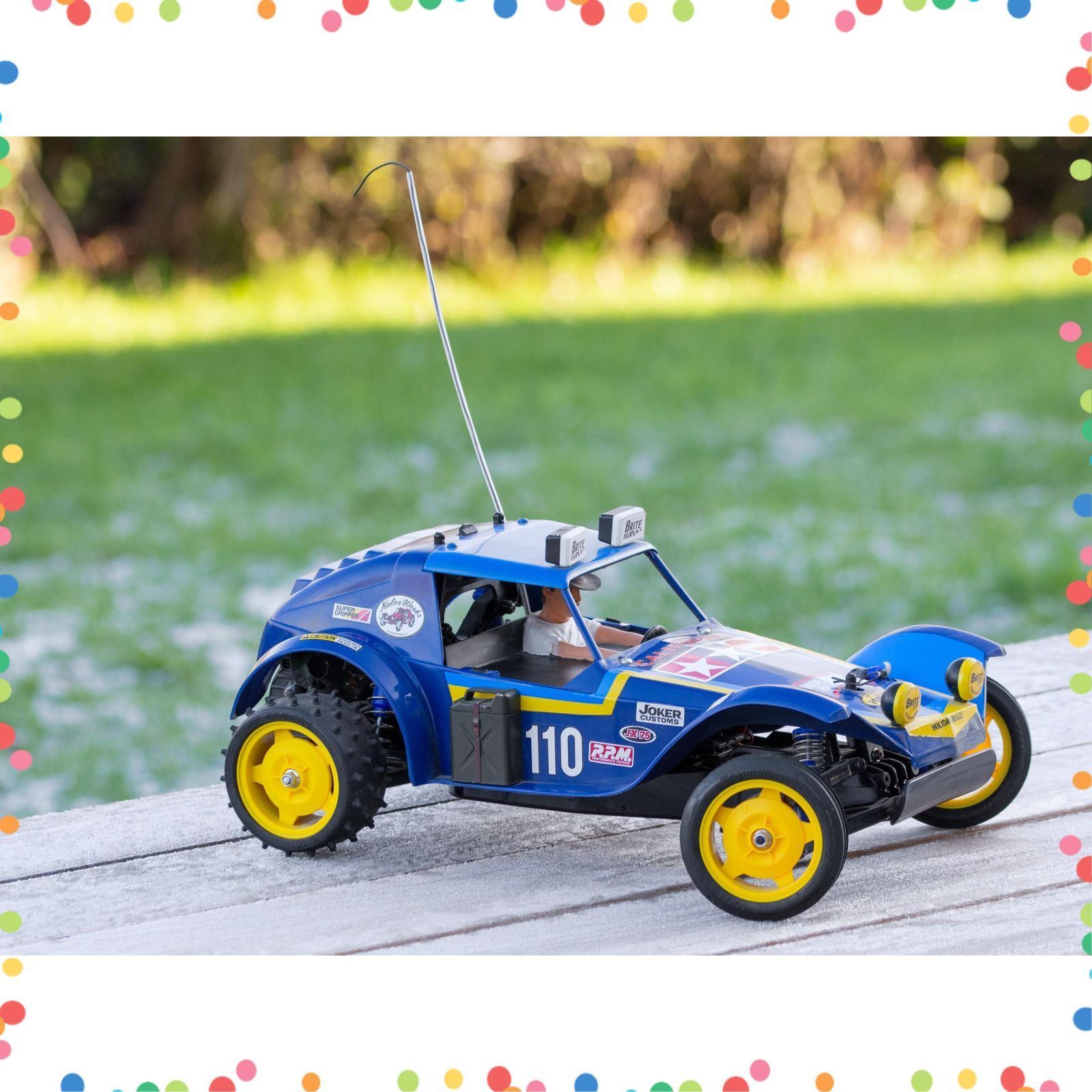 1980年にバギーチャンプ ワーゲンオフローダーの弟分として登場した、電動ラジオコントロール2輪駆動バギーのホリデーバギーが帰ってきました。オンロードからオフロードまで場所を選ばず2WDならではの軽快な走りが楽しめ、ショックに強い軟質樹脂製ボディにはテンガロンハットをかぶった塗装済みのドライバー人形も付いてムードもたっぷり。シャーシは4輪ダブルウィッシュボーン サスペンションを装備した現代版のDT-02に変更。もちろん、部品点数をおさえた組み立てやすい構成もうれしいポイントです。