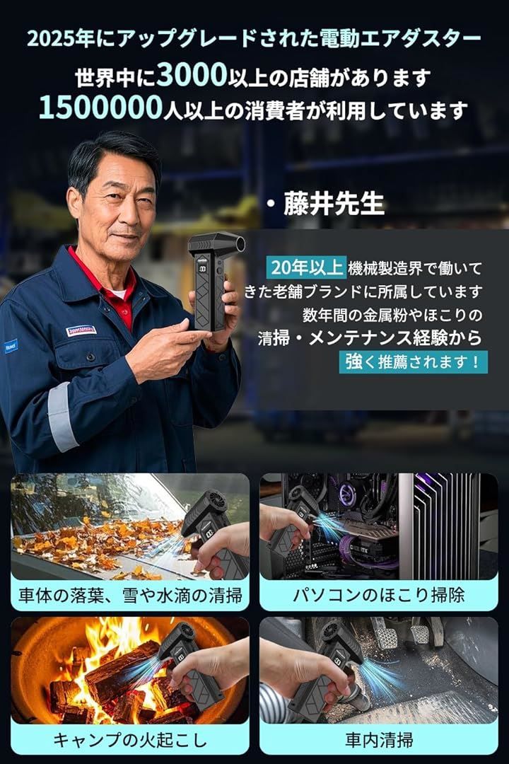 ジェットエンジン並みのパワーと安定性を実現。 (2)超高効率ブラシレスモーター:200,000RPMの高効率ブラシレスモーターが最大風速101m/sを生み出し、業務用レベルの風速を実現。 (3)ダブルタービンファン構造: 2つのタービンファンが大量の空気を吸い込み、瞬時に放出。 (4)専用タービンダクト:特別設計のタービンダクトが風を一点に集中させます。