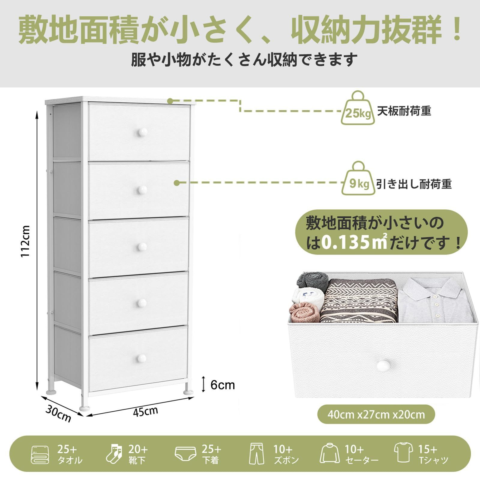 在庫処分 ハイチェスト おしゃれ 大容量 衣類収納ボックス 衣装ケース 引き出し 収納 ランドリー収納 木製天板付き タンス 脱衣所収納 5段 ファブリックチェスト チェスト 転倒防止 REAHOME 幅45 奥行30 高さ112 cm ホワイト