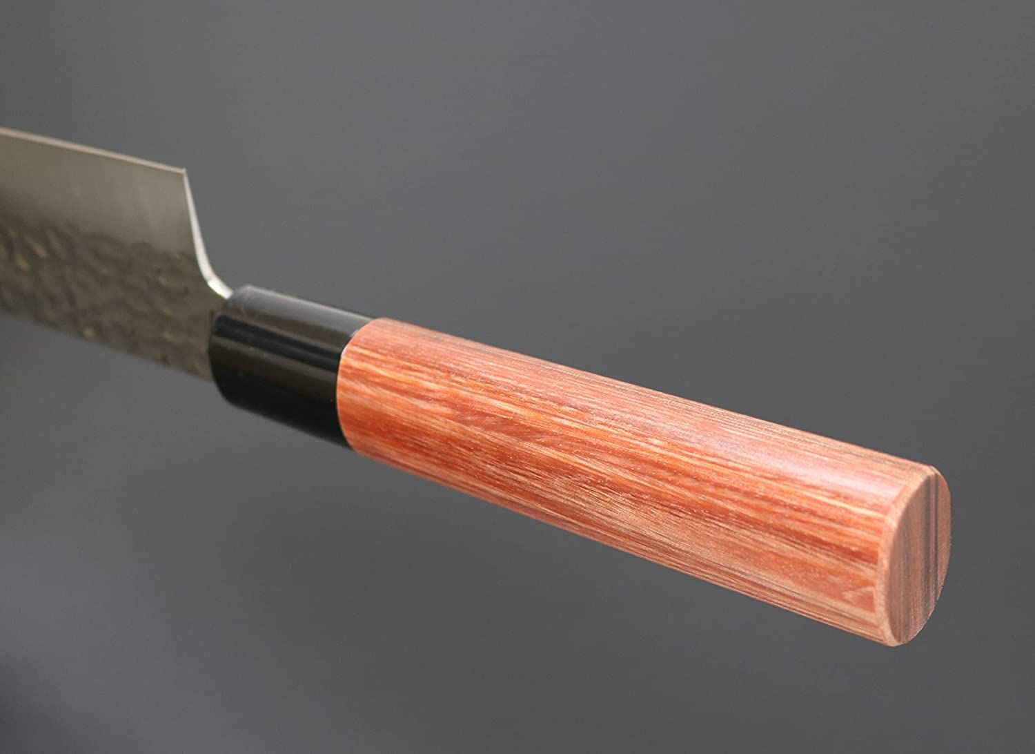 和包丁風のハンドルスタイル。ハンドル材は美しい木目調の赤合板材を使用。鋭い切れ味とメンテナンスの良さを兼ね備えた包丁。鎚目磨きは風合いが美しいだけでなく、食材がブレード面にくっつきにくいこともあり、切れ味を助長し切離れよく快適にカットできます。