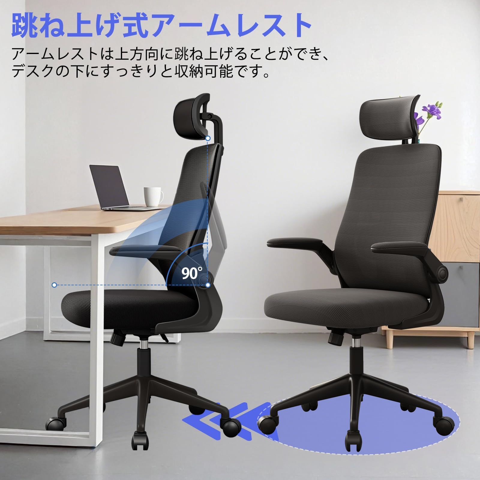 【オフィスにも家庭にも適用多機能デスクチェア】 ビジネスパーソン・学生・在宅ワーカーに最適な「疲れないデスクチェア」。アームレストは跳ね上げ式でデスクの高さに気にせず、手軽にデスク下に収納可能な省スペース設計。静音ナイロンキャスターは床を傷つけず、スムーズ走行。学生の学習椅子、オフィスの会議室椅子、自宅の書斎まで幅広い場面で対応。通気性メッシュ素材が蒸れを防ぎ、一年中サラッと快適なメッシュチェア。