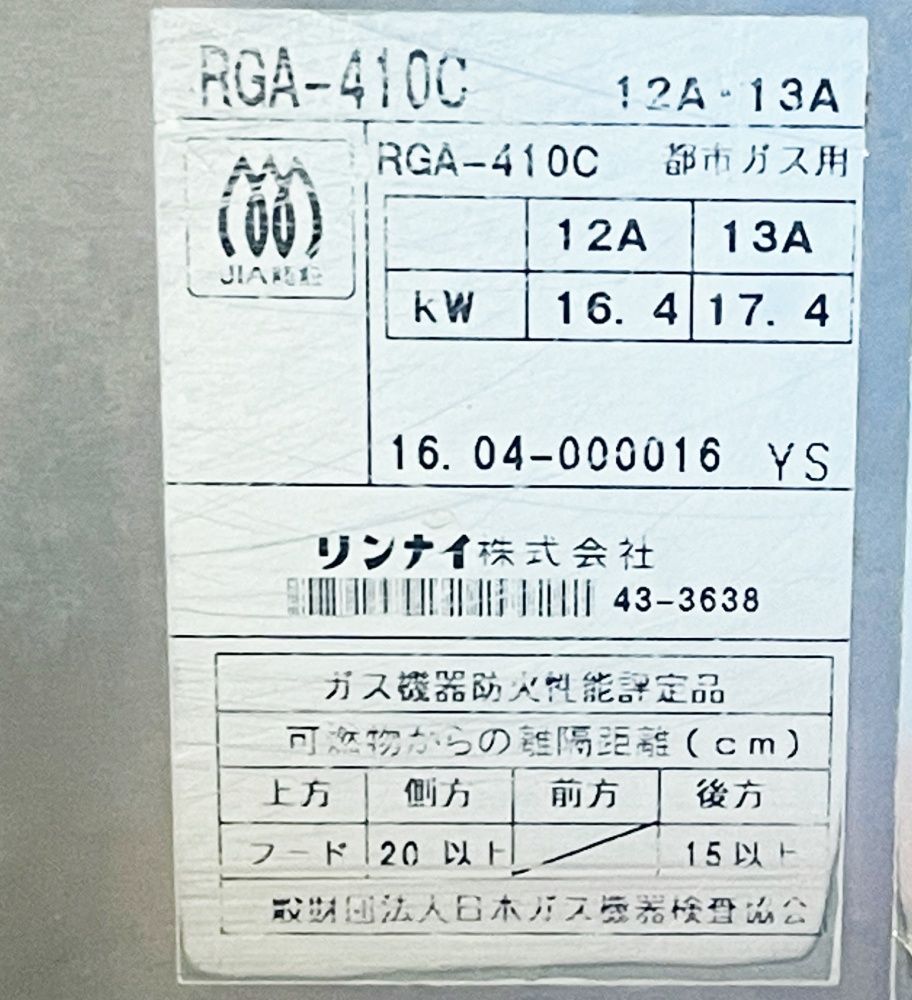 Rinnai リンナイ RGA 410 C 荒磯10号 ガス赤外線グリラー 都市ガス 業務用 1コック1バーナー下火式 焼き物器 1546