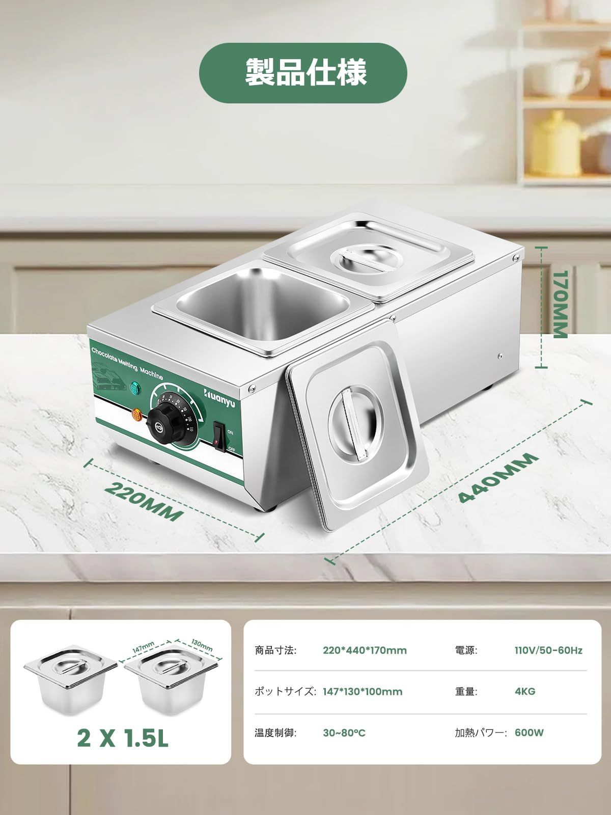Huanyu チョコレート溶融機 2個ポット 溶融用鍋 30-80℃ 湯煎 食品級ステンレス製 DIYチョコ/ミルク/クリーム/バター/チーズ 材料溶融 保温 手作りキャンドル/石けん 日本語説明書付き (110V)