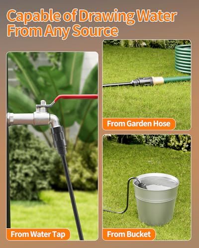 【多様な給水方法】蛇口に直接接続できる蛇口コネクタ、プールやバケツから給水可能な加重フィルター、さらにボトル接続にも対応。場所を選ばないハンディ高圧洗浄機として活躍します。