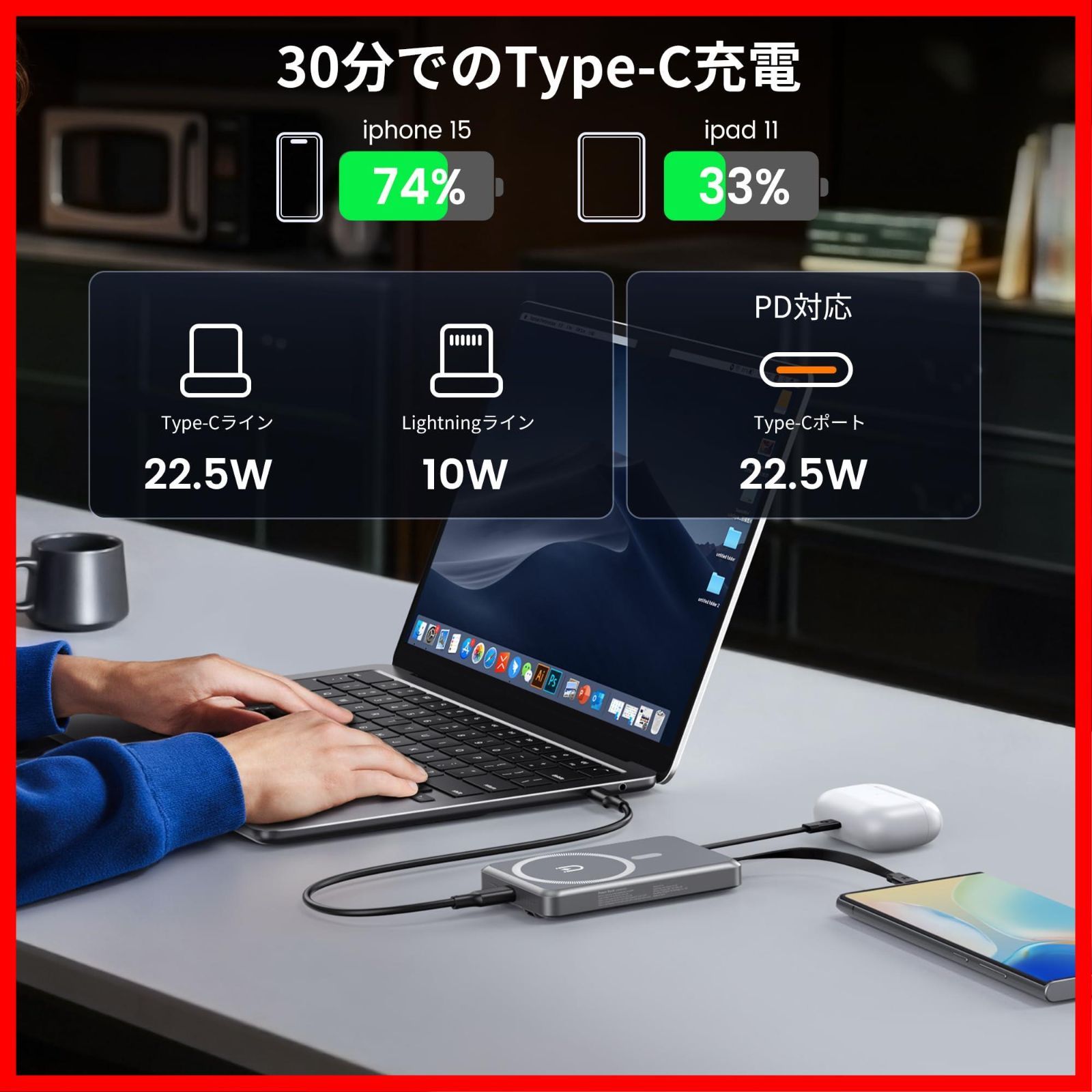 ?【22.5W高速有線充電・PD3.0対応のデュアルType-Cポート】本製品はPD3.0対応&最大22.5W出力のType-Cポートと内蔵ケーブルで、スマホもPCもあっという間にフル充電!朝の忙しい時間や緊急時にも、スピードで差がつくパワフルモデルです。もちろん、Type-Cポートは入力・出力どちらも対応で、これ1本で双方向に使えるのも便利。