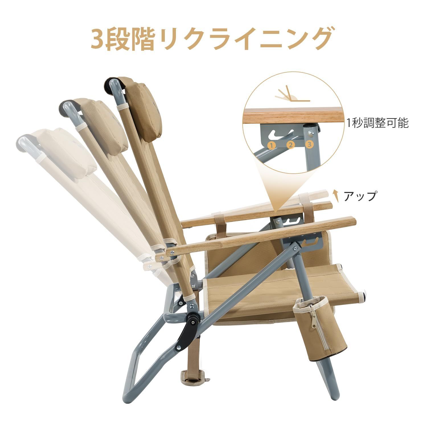→【3段階リクライニング】:天然木制の肘掛を軽く持ち上げることで、折りたたみ椅子の背もたれをお好みの角度に調節できます。また、取り外し可能なヘッドレストも付いているので、昼休みや昼寝の際に頭と首を十分にリラックスさせます。