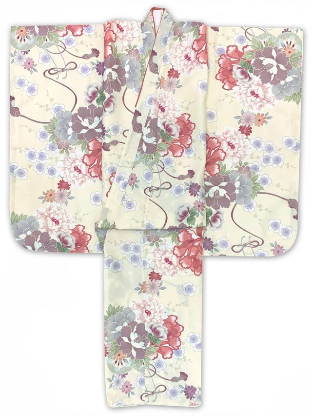 七五三 7歳 女の子用 小紋柄 四つ身の着物と結び帯 他 フルセット クリーム ピンク牡丹 T 7 K 2548 i