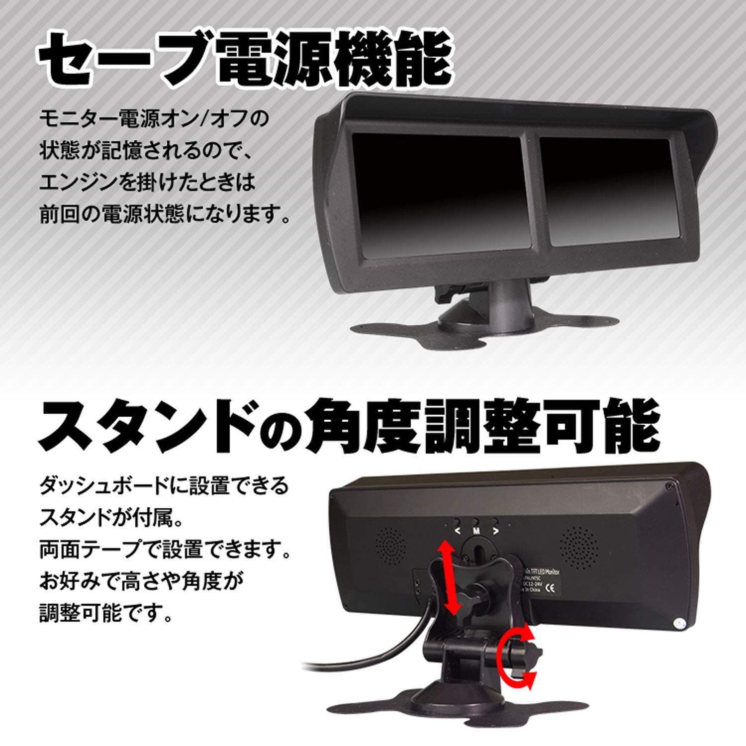 【2画面同時表示】 4.3インチツインモニター搭載で同時に2画面のチェックが可能。それぞれのモニターに2系統の映像入力があるので、例えば前方・両サイド・後方の4つのカメラを接続しておけば、それぞれの画面を2つのカメラでチェック。