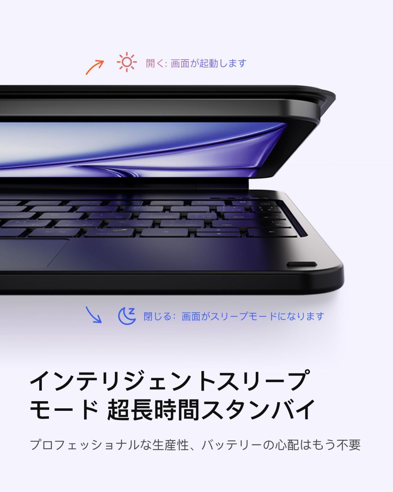 バッテリーの心配なし: 開くと自動で起動、閉じるとスリープになるインテリジェント設計で、超低消費電力待機を実現。たった3時間の充電で、バックライトなしなら1ヶ月、バックライトありでも1週間使用可能。旅行中もバッテリー切れの心配がありません