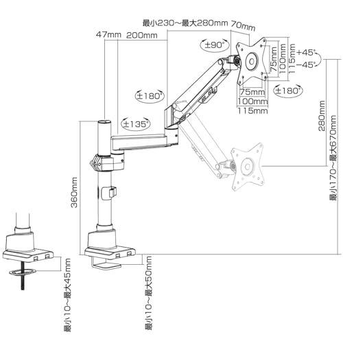 ガススプリング式液晶ディスプレイ用アーム。17-32インチ対応、耐荷重1-9kg。モニターアームでデスク広々、スタンドがなくなり空いたスペースを有効活用できます。