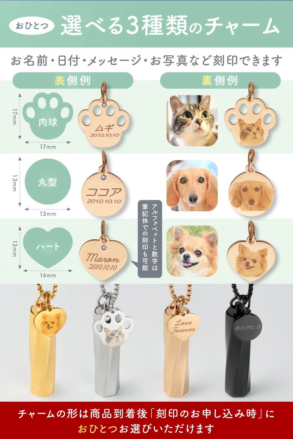 【世界にひとつの刻印チャーム】お名前・日付・メッセージ・お写真など、丸型・ハート・肉球の3種類から、世界にひとつだけの想い出をチャームに刻印できます。