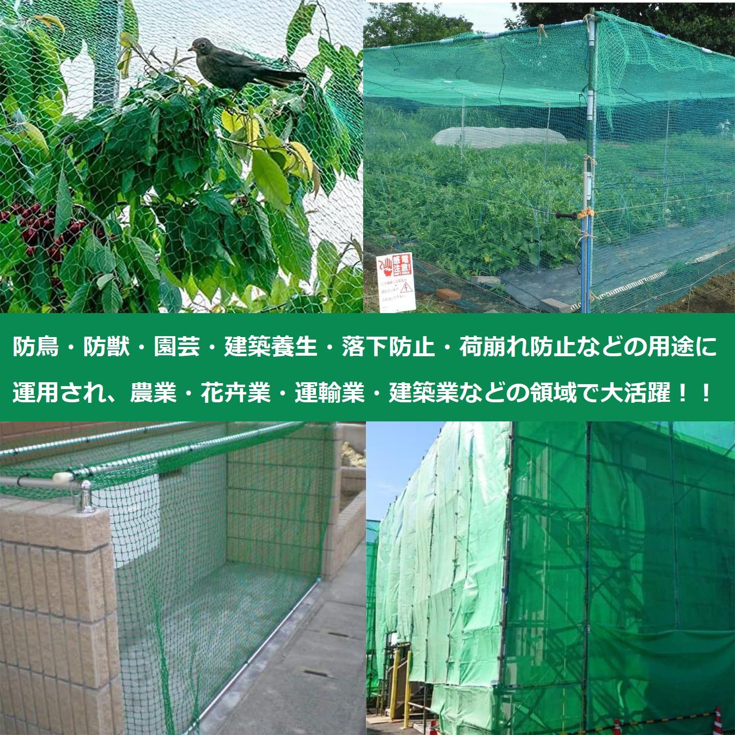 ??【防鳥用ネット】グリーンネットはPP素材を採用し、防鳥ネットとして幅広く使用されております。小さい網目(25mm)で、カラス、ハトのような鳥の侵入を防止でき、野菜・果物をしっかりと守ります。また、兎、猿や鹿などを外側に隔てられるので、防獣ネットとしても使えます。