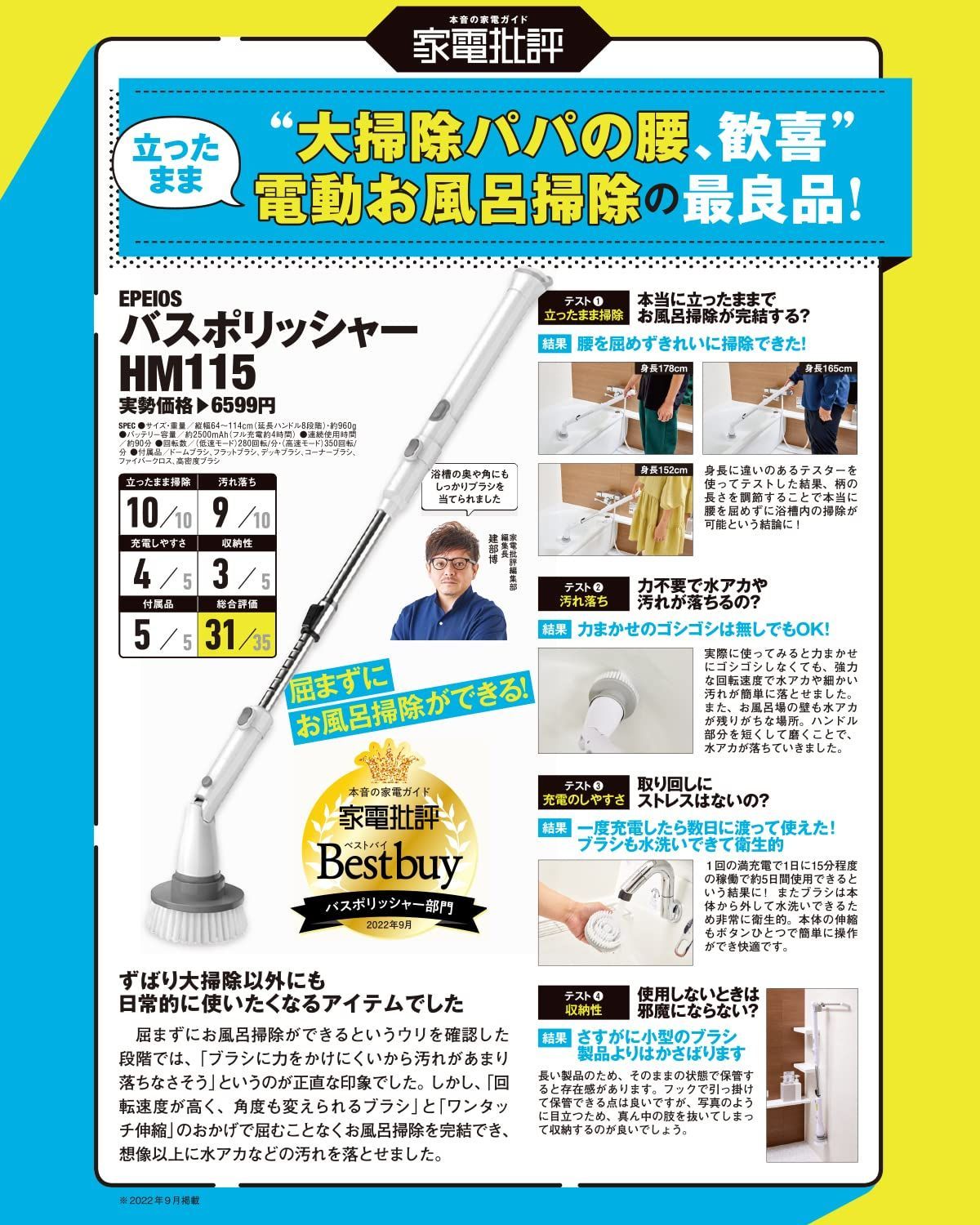 【「家電批評」バスポリッシャー部門 ベストバイ】 エペイオス(Epeios) バスポリッシャー コードレス型 電動お掃除ブラシ ターボプロ 充電式 角度調節 長さ伸縮可能 デッキブラシ お風呂掃除 ブラシ 防水 スティック&ハンディク 大容量電池 手持ち式 4つ取り替えブラシ付き 操作便利 トイレ掃除/床/窓/おふろ/車/ベランダ/玄関の掃除/年末掃除 母の日 ギフト HM115