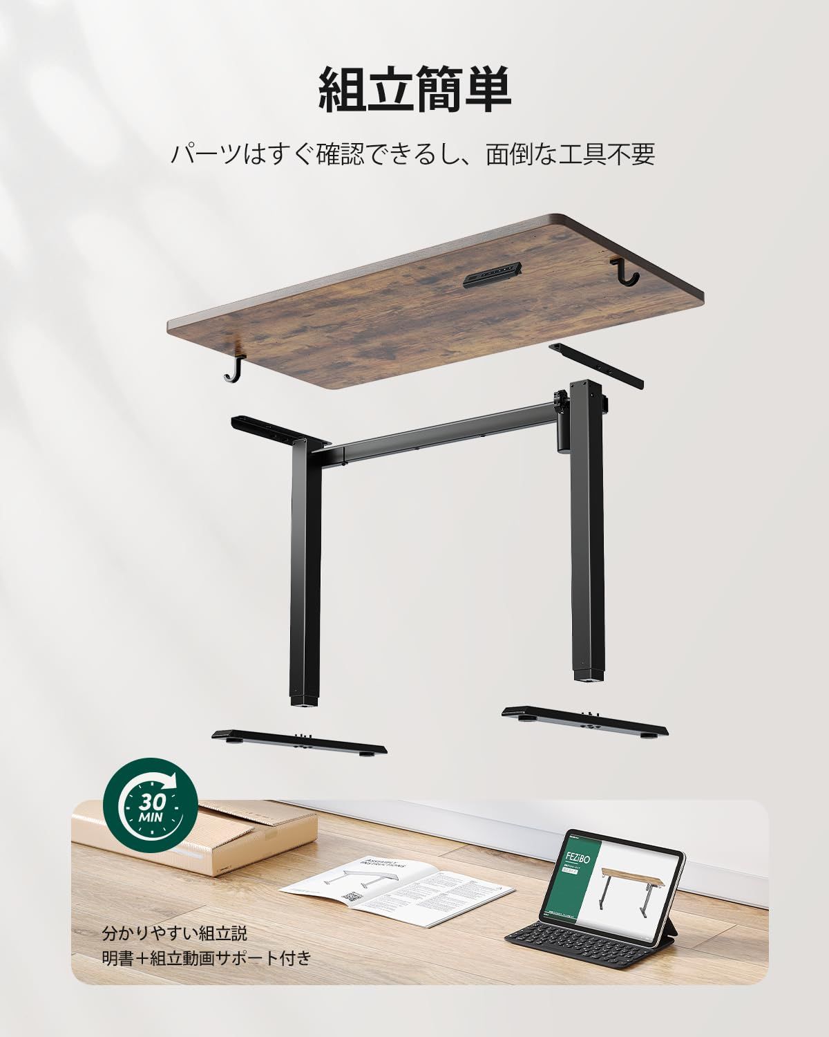 【初心者でも安心の簡単組立&安心サポート】FEZIBO昇降式デスクは分かりやすい日本語説明書に加え、動画マニュアルもご用意。ネジやパーツもわかりやすく整理されており、組立作業は約30分程度で完了します。万が一お困りごとがあった際も、丁寧なカスタマーサポートが迅速に対応いたしますので、安心してお買い求めください。