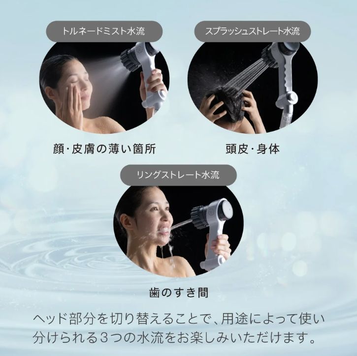 中心部が空洞になった直進性の高い3つの吐水。空洞部で気流を巻き込むことによってウルトラファインバブルを生成します。ウルトラファインバブルを含み、空洞によってあたりは柔らかでも確かな洗浄力を発揮します。 口に向けて使用する場合は、心地の良い水圧になるようにご調整下さい。