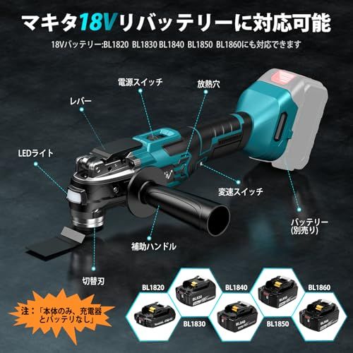 【本体のみ&マキタ 18V バッテリー対応】お客様から「すでにバッテリーがある」とよくお聞きしました。そこで、電動マルチツールの本体が登場します。弊社 Elikliv のバッテリーはもちろん、マキタバッテリーの BL1820b、BL1830b、BL1840b、BL1850b、BL1860b にも対応しています。コードレス式なので、使用場所を選ばず、作業中に線を引っかける心配もありません。屋根の腐敗を修復するために木や釘を切断しようとするとき、手の届きにくい場所でも最適です。