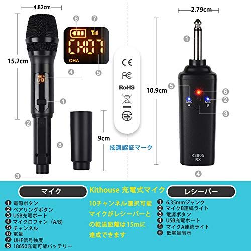 K 380 Sワイヤレスマイク カラオケ 無線マイク 充電式ダイナミックマイク UHF 10チャンネル 技適認証済 ハンドヘルドマイク 6.35 mmレシーバ付き 複数台同時使用 日本語取扱書付き 会議 カラオケマイク ホームパーティーに大活躍 2 f b 0 d c 7