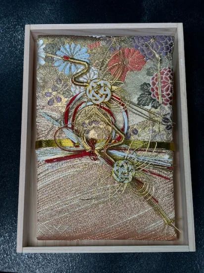 着物/帯から作られたご祝儀袋です水引もイメージに合わせて仕上げました