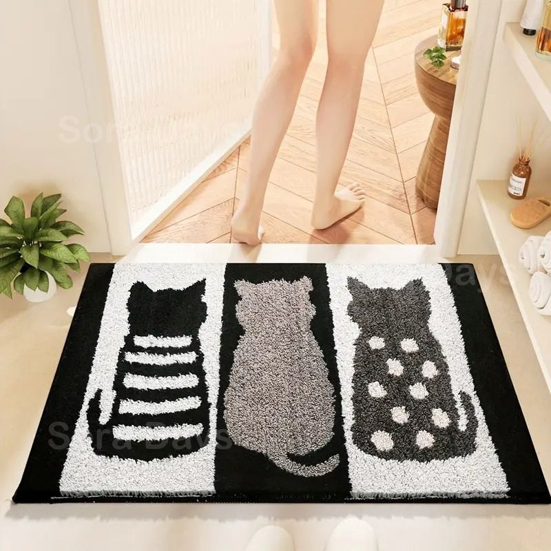 バスマット ねこ柄 モノトーン ふわふわ インテリア 北欧 動物 滑り止め 吸水性 速乾 ポリエステル 45 65 cm 50 80