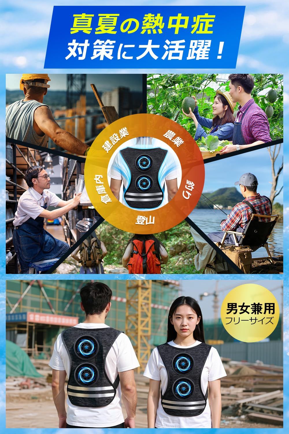 【暴風ファン×アイスパックのW冷却!瞬間-30℃で全身クールダウン】 猛暑の屋外作業やレジャーも、これ1枚で乗り切れる!本冷却ベストは上下2基の暴風ファンを搭載し、立体的な風の流れで体温上昇を素早く抑えます。さらに付属のアイスパックを装着すれば、体感温度が最大30℃も低下。わずか数秒でひんやり快適な状態に導きます。4段階の風量調節で微風強風まで自由に切替可能。炎天下の工事現場・農業・釣り・スポーツ・アウトドアなど、夏のあらゆるシーンに欠かせないファン付きベストです。