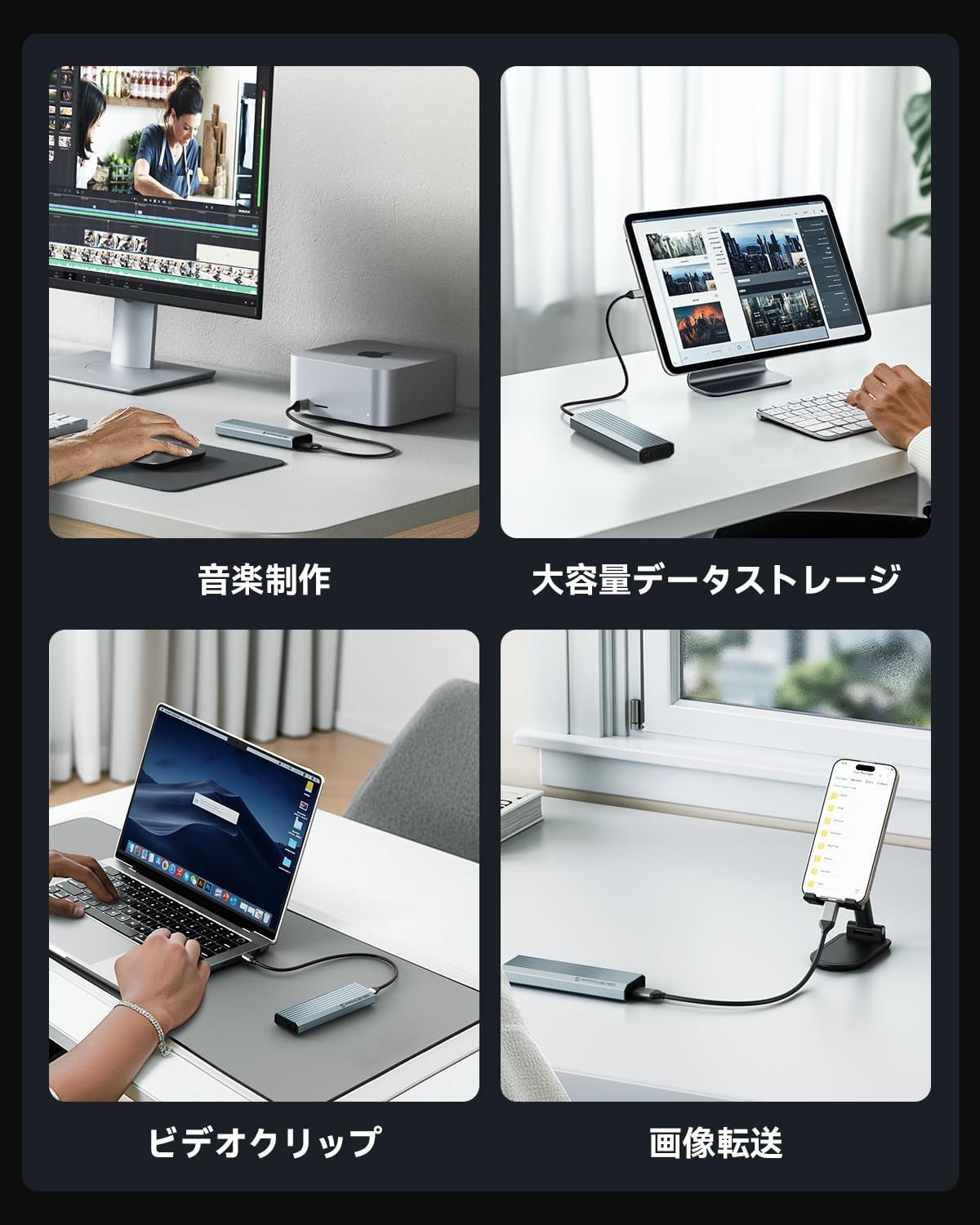 【注: 互換性の問題】40Gbps M.2 NVMe SSDエンクロージャーは、M-Key インターフェイスを備えた SSD のみをサポートし、2230/2242/2260/2280と互換性があり、最大 4TB NVMe SSD と互換性があり。iPhone 15Pro/Pro Maxと互換性なし; iPadと互換性あり; M1/M2/M3チップのMacBookと互換性がある 、IntelチップのMacBookと互換性がない ; Mac StudioおよびMac Miniと互換性があります; Windows 12、13以降と互換性があります。 プラグアンドプレイ、ドライバーは不要です。
