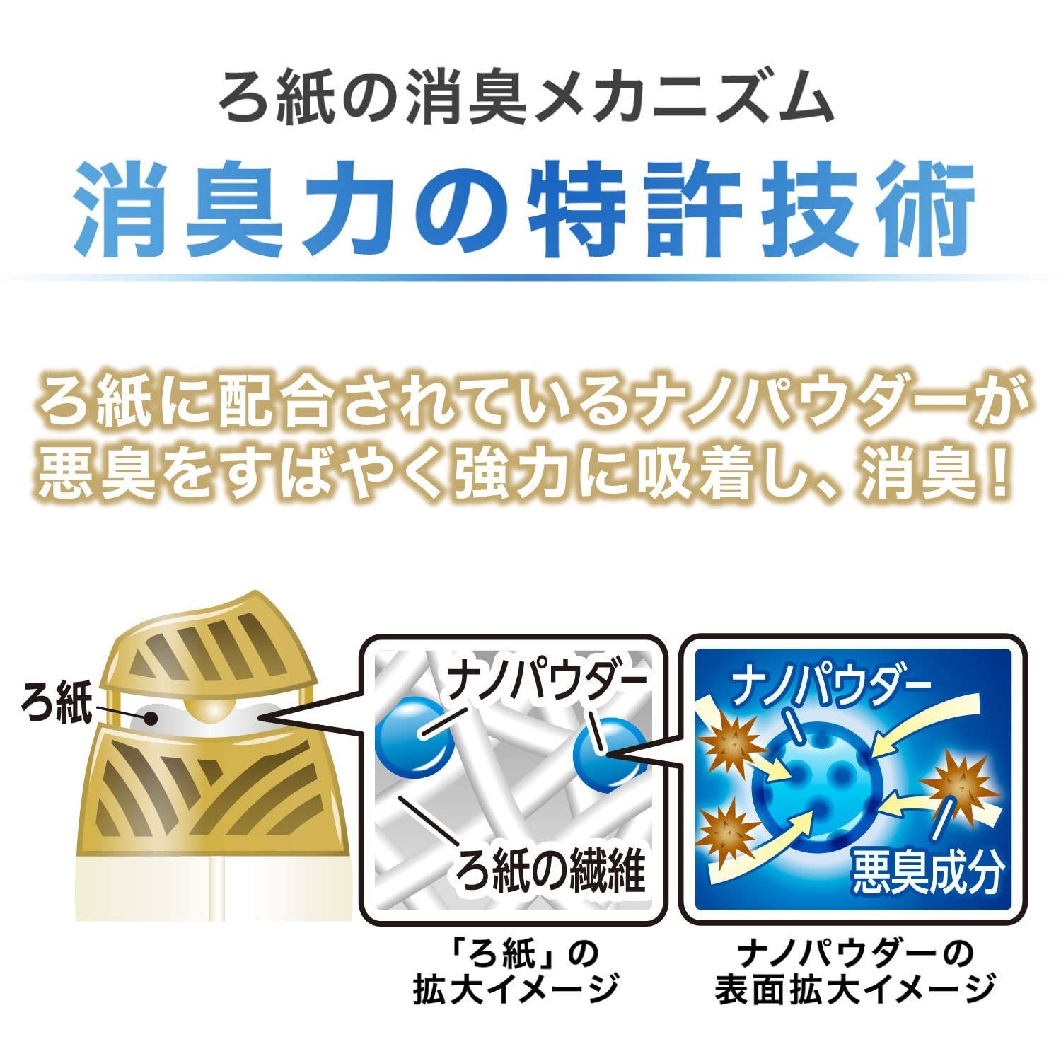 ●ナノパウダー配合(※ナノレベルの孔(あな)を持つ、悪臭を吸着する消臭剤)で、すばやく強力に空間を消臭。