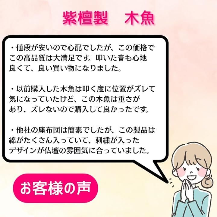 「自宅で法要する方に最適な理由 その(3)」 紫檀材を使用している為、一般的な木材よりも重く、小ぶりな5寸サイズでも叩いた時にずれにくい