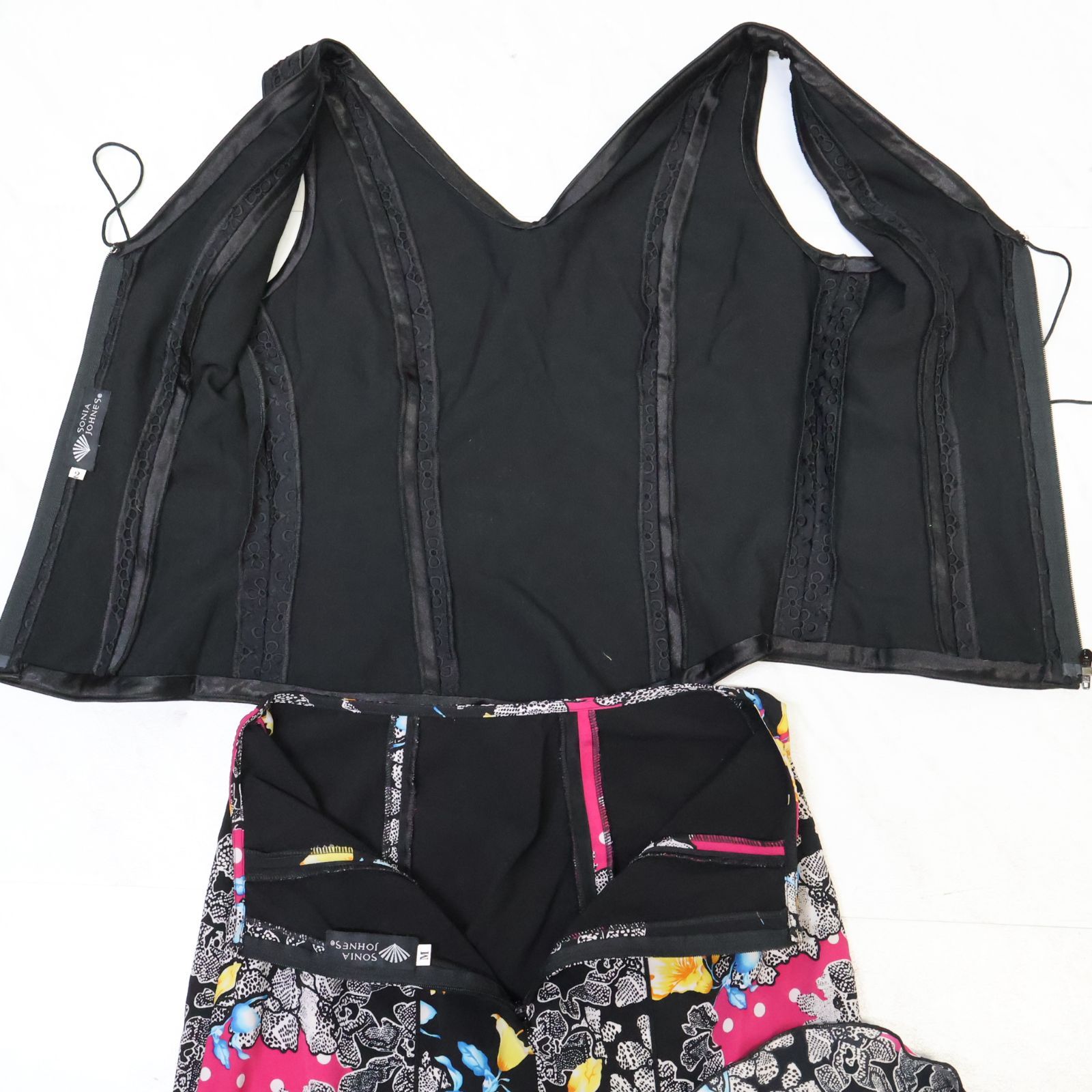 フラメンコ衣装 ブラック SONIA JOHNES ソニアジョーンズ 上下セット ツーピース シージョ付き 黒 ボランテ 柄 紫 ブラウス ピキージョ ファルダ トスカート トップス 袖なし レース ダンス用 発表会 レディース 模様 ドット 水玉