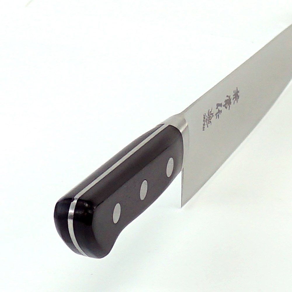 飾り気のないシンプルで機能的なデザインで、信頼できるパートナーとなる包丁です。最高品質モリブデン鋼AUS-10を採用し、錆びにくく鋭い切れ味を誇り、ブレード構造はAUS-10ステンレス鋼の単層鋼(全ステンレス)。中子形状は 本通し(ハンドル部全部=フルタング)で、口金は溶接されています。ハンドル材の黒合板は耐水性の丈夫な材質で、しっかりと三か所でカシメられ、ハードユースに耐えうる構造の業務用包丁です。牛刀180mmは、一般のご家庭においても大変使い勝手が良くスタイルで、三徳同様に人気があるモデルです。