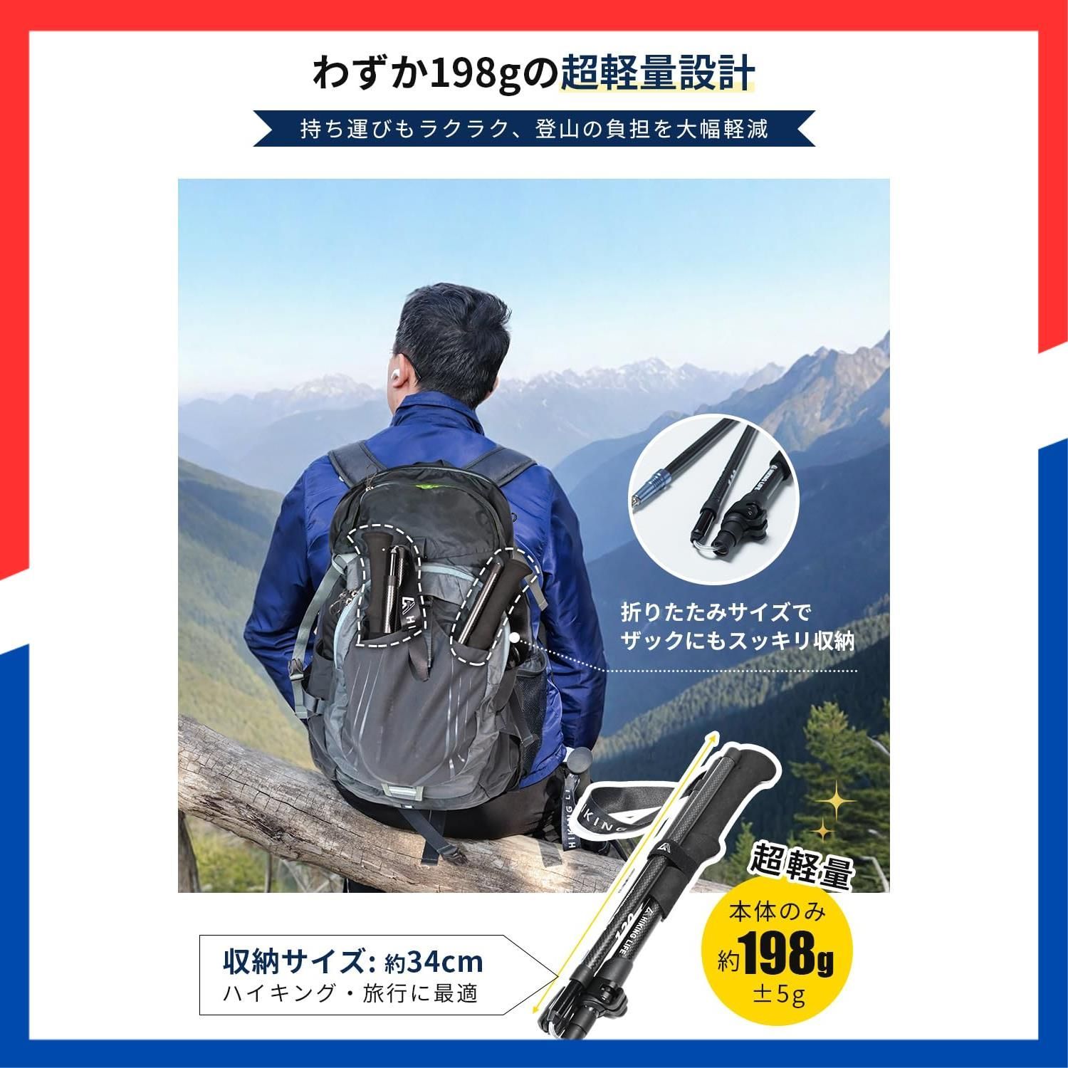 【超軽量デザイン・日本人向けローカライズ設計】1本あたりわずか198?g(付属品を除く/測定誤差±5?g)と超軽量でありながら、優れた強度と耐久性を実現しています。また、グリップ形状やレバー位置は、日本の登山スタイルを踏まえて最適化されています。 シャフトの長さも日本人の体格に合わせて調整されており、より快適な使用感を追求しました。長さは100~120?cmまで調節可能で、身長150~185?cmの方に対応しています。初心者から上級者まで、安心してお使いいただけます。ぜひお手に取ってご体感ください。※本製品は150cm前後の方でもご使用いただけますが、ご高齢の方など、姿勢によっては使いづらい場合がございます。ご自身に合うかどうかご確認のうえ、ご検討ください。