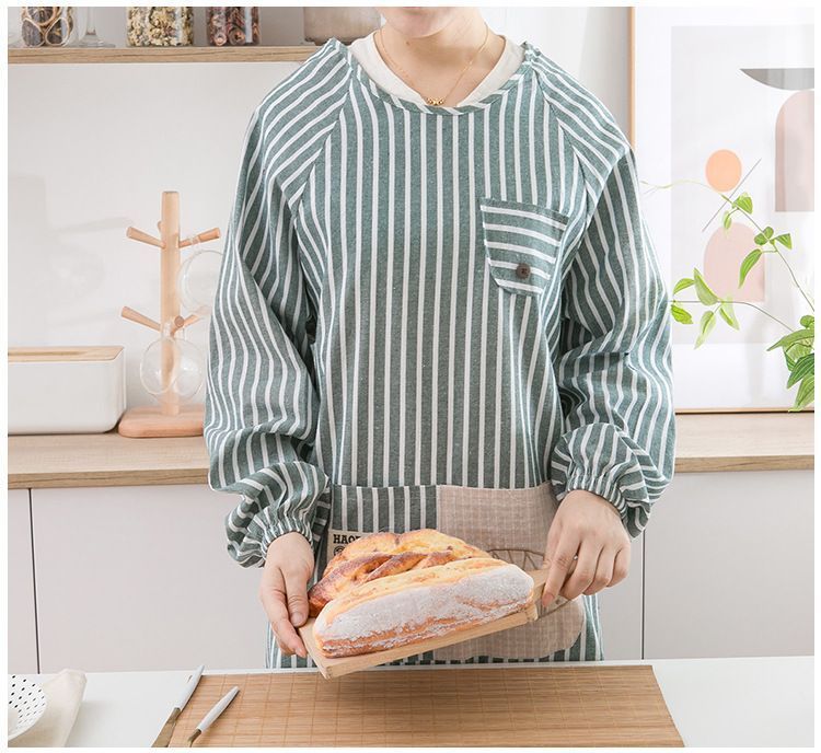 割烹着 かわいい おしゃれ かっぽう着 エプロン スモック 大人 保育士 長袖 防水 防汚 袖付き シンプル ストライプ ポケット 料理 キッチン fengxz 184