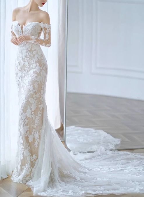 フラワーレース ウェディングドレス 長袖 マーメイド 上品
