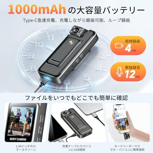 「ニーズに応える多機能性、より良い撮影体験」4個強力なLEDライトが付いているので、真っ黒な所でも画面を鮮明的に映します。180度回転レンズで撮りたい角度に自由に向けられます。製品の真ん中に大きな広角レンズを搭載し、ピントの合う範囲が広くなり、広い視野を実現。携帯とパソコン取り込み用のUSBカードリーダー付属して、スマホとパソコンで録音とビデオをいつでも確認または転送できます。ウォーキングの記録としてリュックにつけて、近くのものから遠くの景色までくっきりと撮影できます。散歩や登山で活躍しそうです。