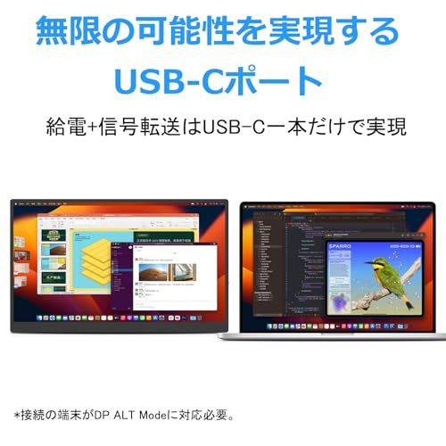【USB Type-C採用! ケーブル1本でPCと接続できる!】「USB Type-Cディスプレイ給電」に対応しているので、添付しているUSB Type-Cケーブルで接続することにより、パソコン・スマホからの映像出力と給電がケーブル1本で行われます。電源コンセントに繋ぐ必要がないため、どこでも好きな場所でお使いいただけます。また、専用ドライバーも不要で購入後すぐにお使いいただけます。※パソコンに映像出力(DisplayPort Alt Mode)対応のUSB Type-Cポートが必要です。