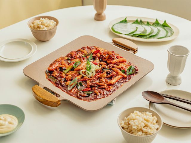 熱伝導率が高く、遠赤外線効果で食材の中まで素早く熱が通ります。抜群の機能性調味料や焦がしたくない食材を端に置くことができる、便利なスクエアデザインです。