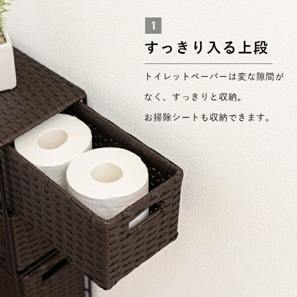 隙間に収まるトイレラック。通気性の良いバスケットの引出しにペーパーロールや小物を収納できます。