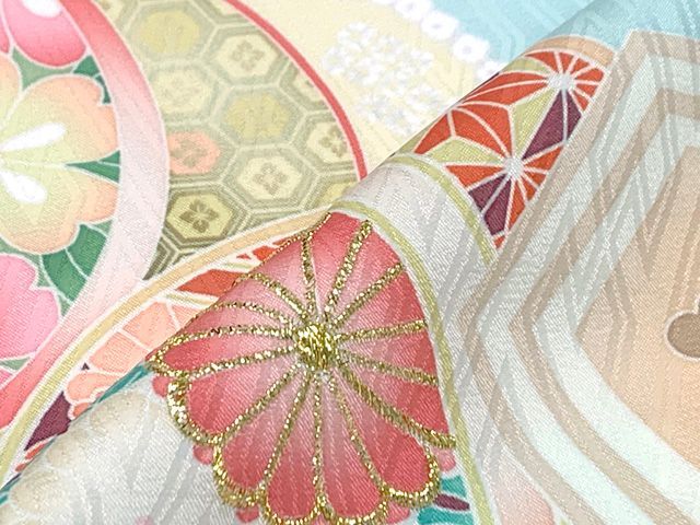 七五三 着物 7歳 女の子 式部浪漫ブランド 絵羽柄の着物 四つ身 子供振袖 合繊 水色 鞠梅 SR 7 pea 2502 tan