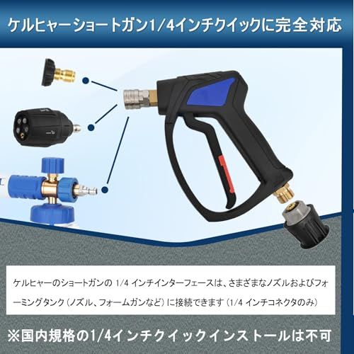 【対応種類】ケルヒャーショートガンテール部のサイズがM22-14MMであれば、従来通り幅広いケルヒャー高圧洗浄機に対応します。M22-14mmめねじジイントのホースに直接接続できます。(Generac、Simpson、Briggs Stratton、Craftsman、Karcher、Ryobi圧力洗浄機などのM22-14mmホースを備えた圧力洗浄機と互換性があります。)先端は1/4インチのクイックメスインターフェースを採用、任意の1/4インチクイックサブコネクタに接続できます(海外規格のみ)。