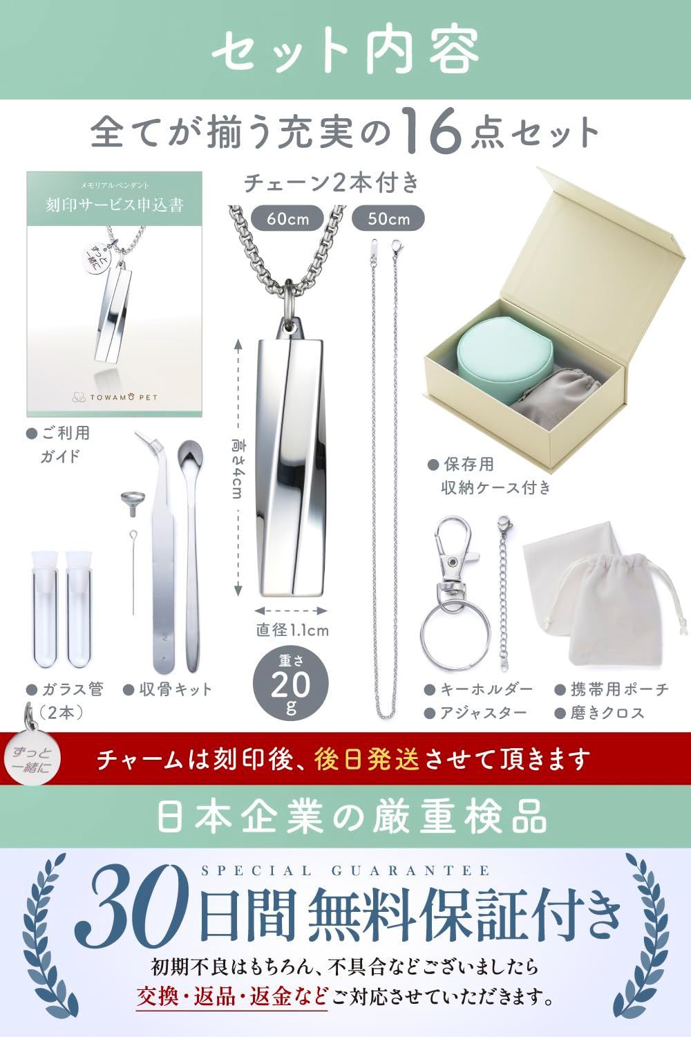 【全てが揃う16点セット】 キーホルダーパーツ付属でカバンなどに取り付けて、いつも一緒にお出かけすることができます。 遺骨ペンダントとして着けないときはペンダントケースに入れて飾り、手元供養することができます。 末長いご使用を想定し、予備のガラス管・磨き布・携帯用ポーチ・保存用ボックスなど必要なものが全て揃う充実の16点セット。 ご購入後のアフターケアも迅速に対応させていただきます。