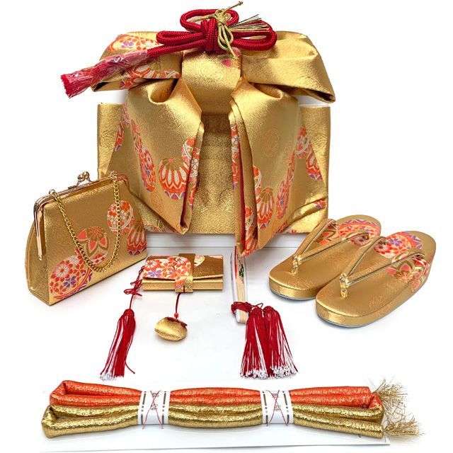 正絹 七歳女の子四つ身の着物に、結び帯やハコセコセットをコーディネートしたフルセットです。