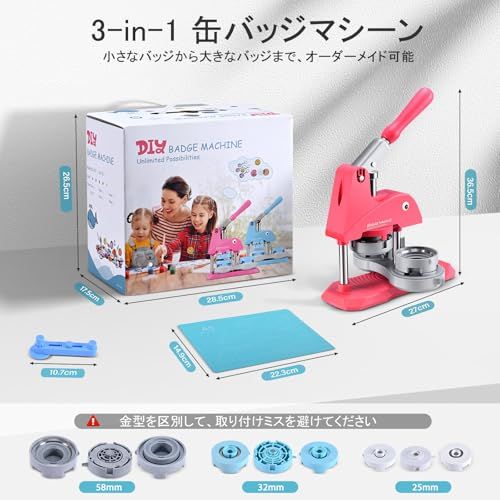 【3種類の交換可能な金型】:この製品には、25mm、32mm、58mmの3種類の交換可能な金型が装備されており、個人の好みに応じて異なるサイズのバッジを自由に作成することができます。