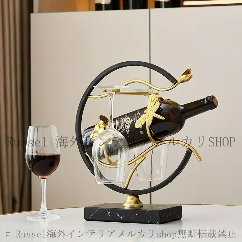 Russel海外インテリア、メルカリshop店のエレガントなデザインのメタル製ワインラック&グラスホルダー。シンプルながらも洗練された装飾が印象的で、どんなインテリアにも調和するスタイルを持っています。ワインボトルとグラス2本を美しく飾ることができ、特別な日を演出するアイテムとして活躍します。その存在感はお部屋にさらなる魅力を添え、ゲストを招く際の話題にもなることでしょう。