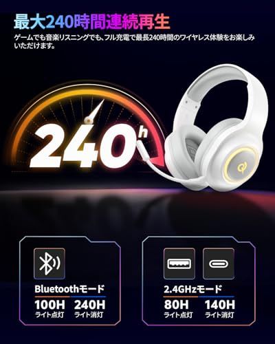 【長寿命バッテリー&220時間連続再生】Heroad V200ヘッドセットは、ゲームでも音楽リスニングでも、フル充電で最長220時間のワイヤレス体験をお楽しみいただけます。※LEDライト点灯時は最長100時間の連続使用が可能。充電のためにゲームを中断する必要がなく、一日中ゲームやフレンドとのボイスチャット、音楽鑑