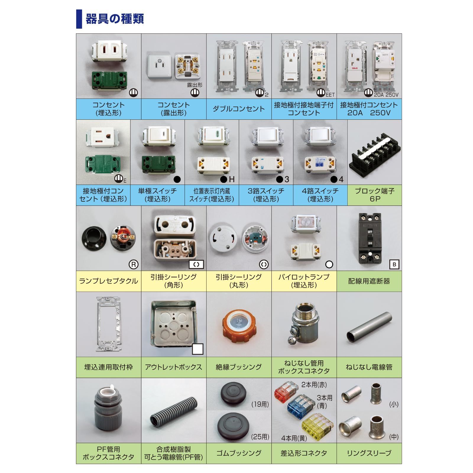 【器具】過去の試験で実際に使われたメーカーを中心に器具を選定。器具の再利用を前提としています。(リングスリーブ除く)