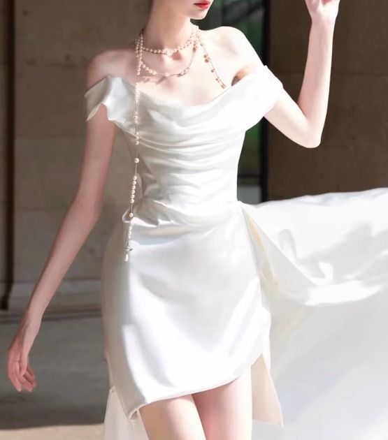 オフショルダー ドレープ ウェディングドレス 韓国 ミニ丈