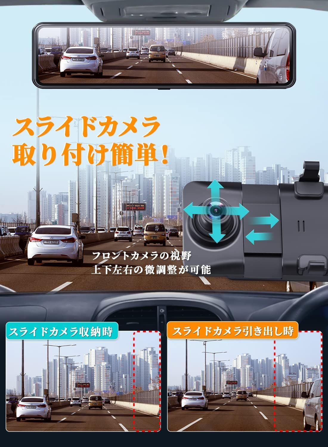 【スライド式フロントカメラ+右ハンドル用カメラのデザイン+LED信号機/地デジへ干渉対応】 ?新型のスライド式フロントカメラを搭載しており、従来のドラレコに比べて、柔軟に調整可能で取り付けがより容易になります。カメラは上下左右の微調整が可能です。スライドで調整できるカメラの距離は左右3cmです。 撮影範囲が従来品に比べ20%拡大し、視野が広げることで安全で快適なドライブをサポートします。?本製品は日本仕様で左側を通行する車両に適した右ハンドル用カメラを搭載しております。 カメラが右側ハンドル仕様でない場合、視野の一部が死角となり、撮影することができません。右側仕様で従来のドラレコよりも右側の死角を作りません。?本製品はフレームレートが27.5fpsのドラレコですので、東日本と西日本のLED信号機の場合でも、撮影した信号機が消えてしまう現象を避けることができます。ドラレコによる電波障害が起こることを防止するために、FMアンテナとや地デジの周波数と重ならないに設計しています。