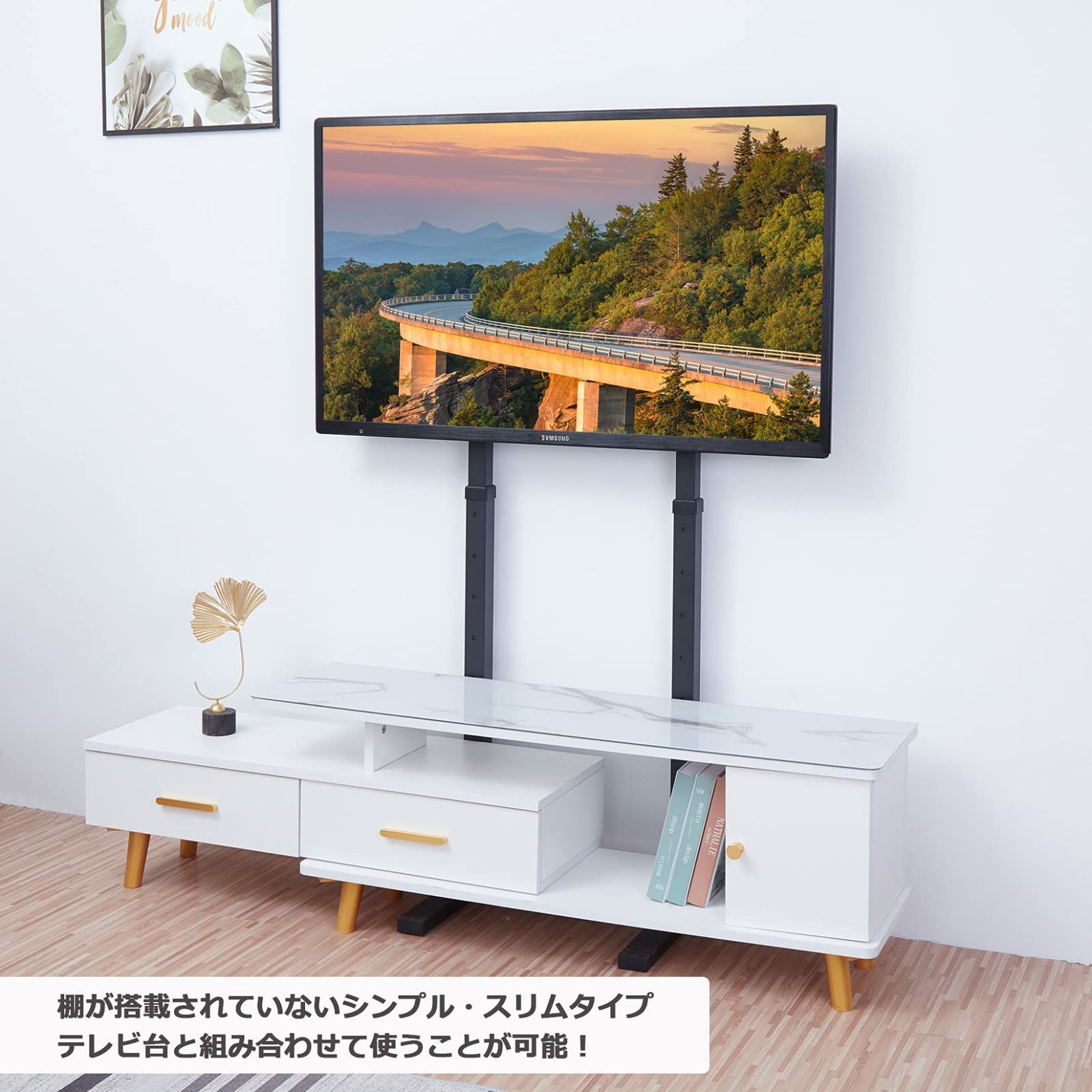 【穴あけ不要・賃貸OK 】ぴったりと壁に寄り添うスリムデザインで、テレビ台と組み合わせて使うことが可能で、壁に穴を開ける必要がないため、賃貸でも遠慮なく使用できます。